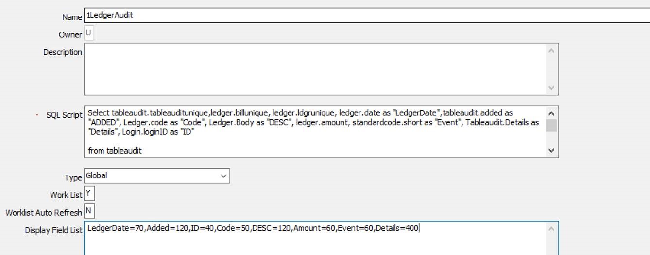 Select tableaudit.tableauditunique,ledger.billunique, ledger.ldgrunique, ledger.date as "LedgerDate",tableaudit.added as "ADDED", Ledger.code as "Code", Ledger.Body as "DESC", ledger.amount, standardcode.short as "Event", replace(replace(Tableaudit.Details,char(10),' '),char(13),' ') as "Details", Login.loginID as "ID"