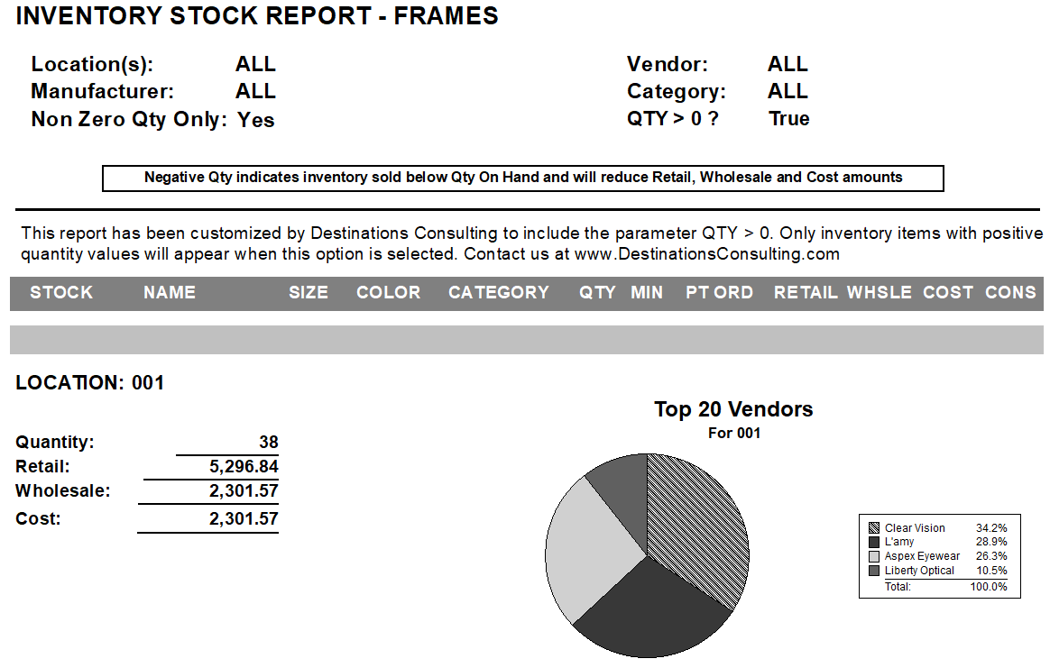 This report was customized by Destinations Consulting and is provided at no charge to your practice. It improves upon the existing report by limiting frames to only those with a value over 0, which eliminates negative values that could skew inventory numbers.