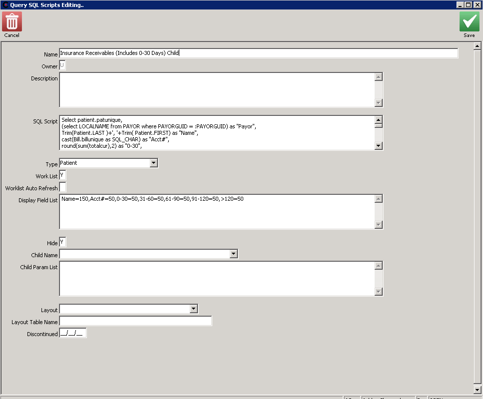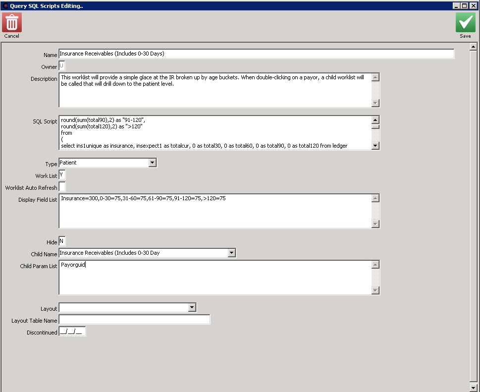 You can name this worklist whatever you'd like. We've named ours "Insurance Receivables (Includes 0-30 Days)". Make sure to include a description of this worklist for anyone else who may access these worklists. Copy and paste the following script into the SQL Script field: