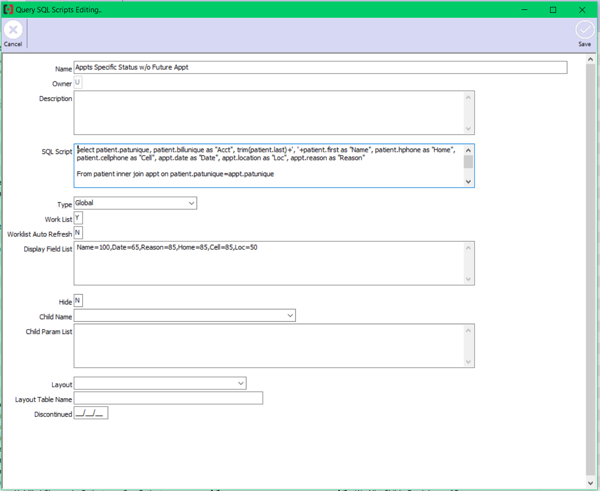 You can name this report whatever you'd like. We've named ours "Appts Specific Status w/o Future Appt" Make sure to include a description of this worklist for anyone else who may access these worklists. Copy and paste the following script into the SQL Script field: